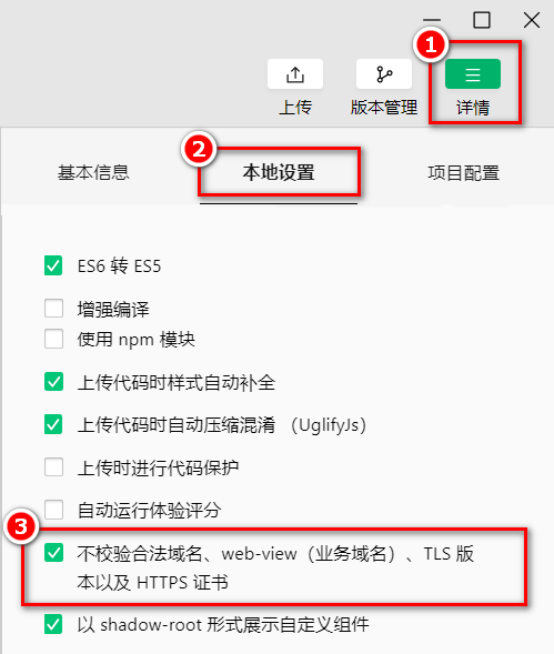 如果后端程序员 仅仅提供了 http 协议的接口 、暂时没有提供 https协议的接口 。 此时为了不耽误开发的进度,我们可以在微信开发者工具中,临时开启「 开发环境不校验请求域名、 TLS 版本及 HTTPS 证书 」选项, 跳过 request 合法域名的校验。